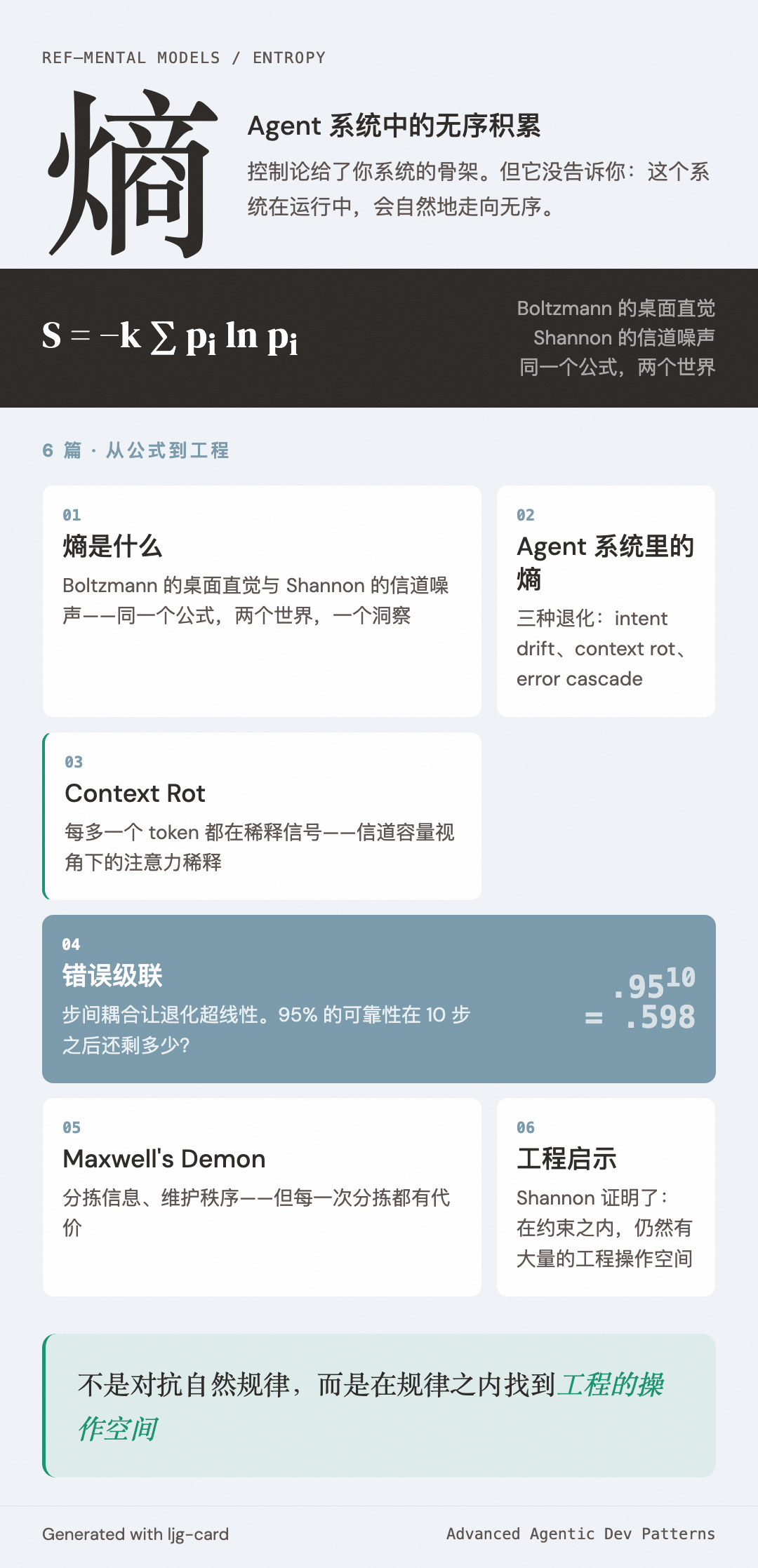 跟你做对了什么、做错了什么无关。在一个非确定性系统中,熵增是默认方向。这是热力学第二定律的信息论版本,它同样适用于 agent 系统。