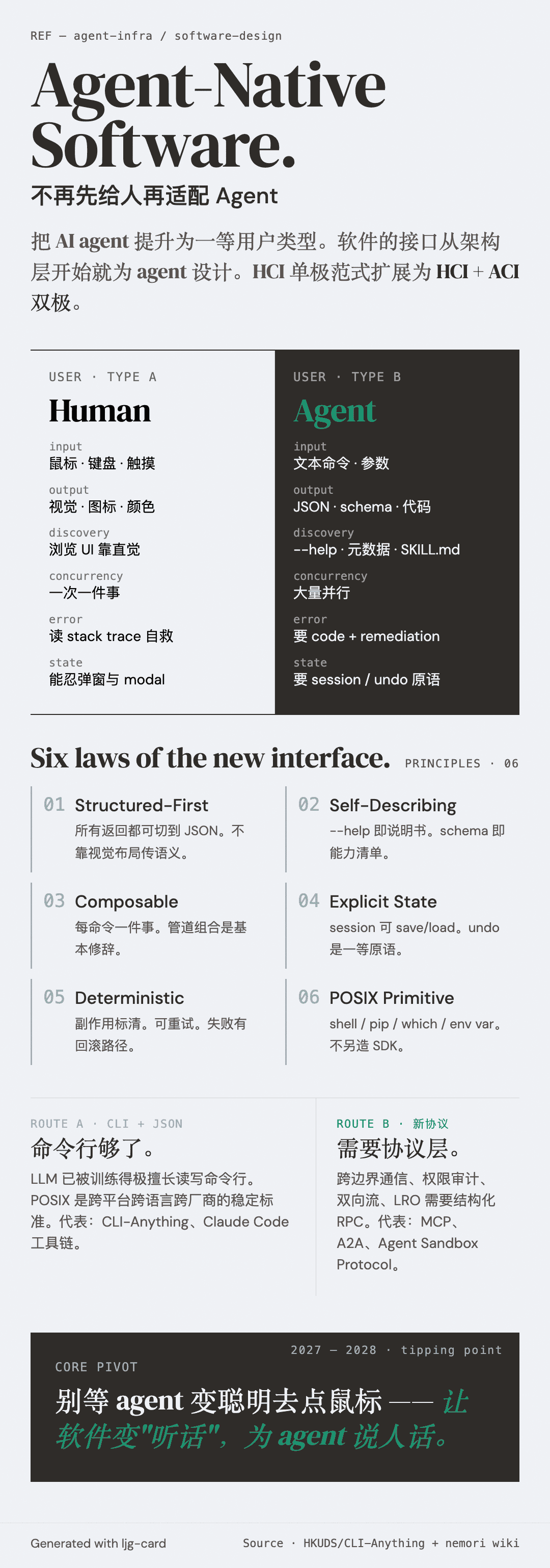 两类用户的需求差异大到足以推导出不同的软件形态。Agent-Native Software 就是这个推导的结果:专门为 agent 这组需求设计接口的软件。