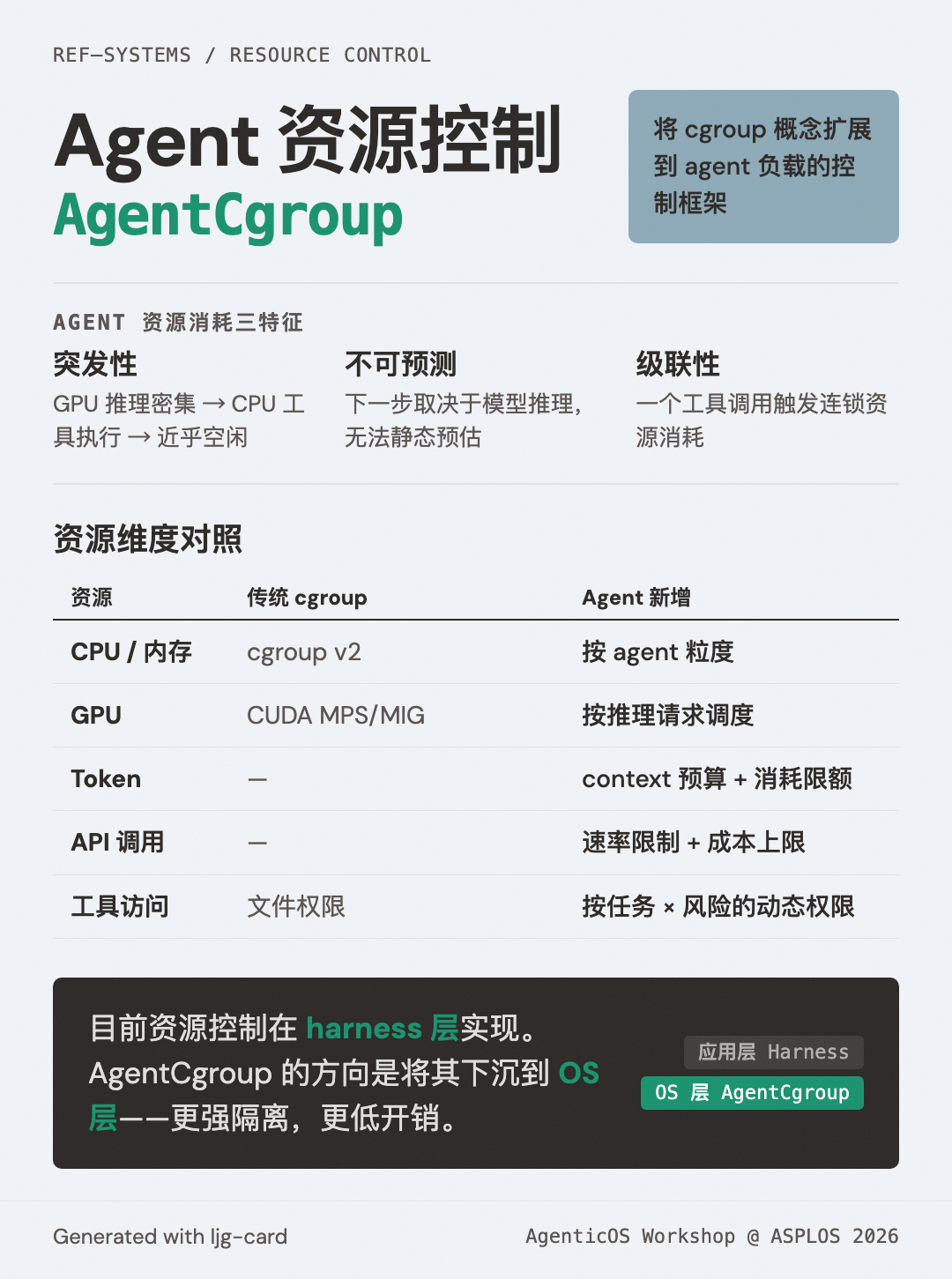 AgenticOS Workshop 中的 AgentCgroup 论文(Zheng、Fan、Fu 等)首次系统研究了 AI agent 的 OS 资源消耗模式,并提出将 Linux cgroup 概念扩展到 agent 负载的控制框架。