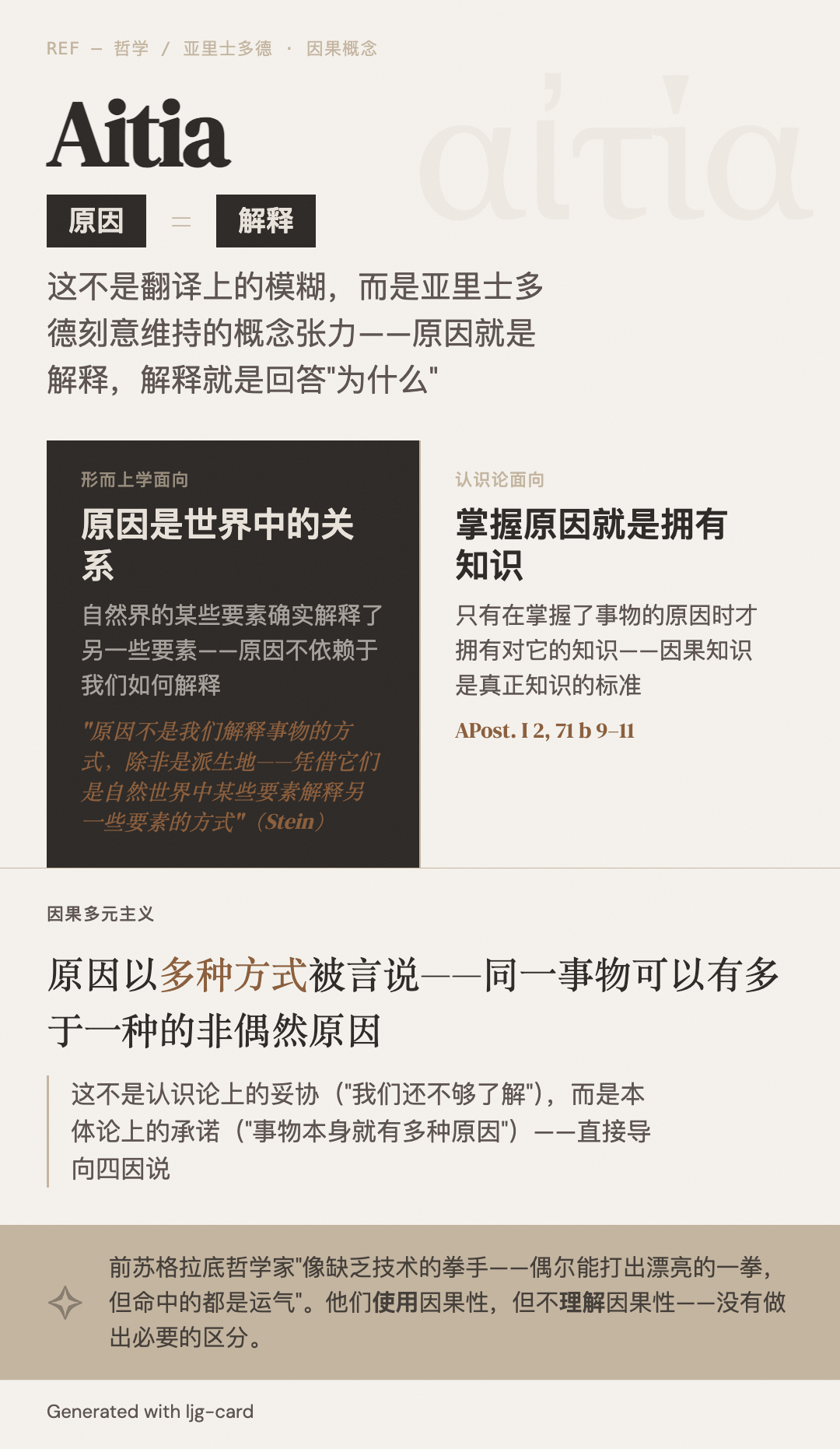 - 认识论面向:掌握原因就是拥有知识——"我们认为只有在掌握了事物的原因时才拥有对它的知识"(APost. I 2, 71 b 9–11)
