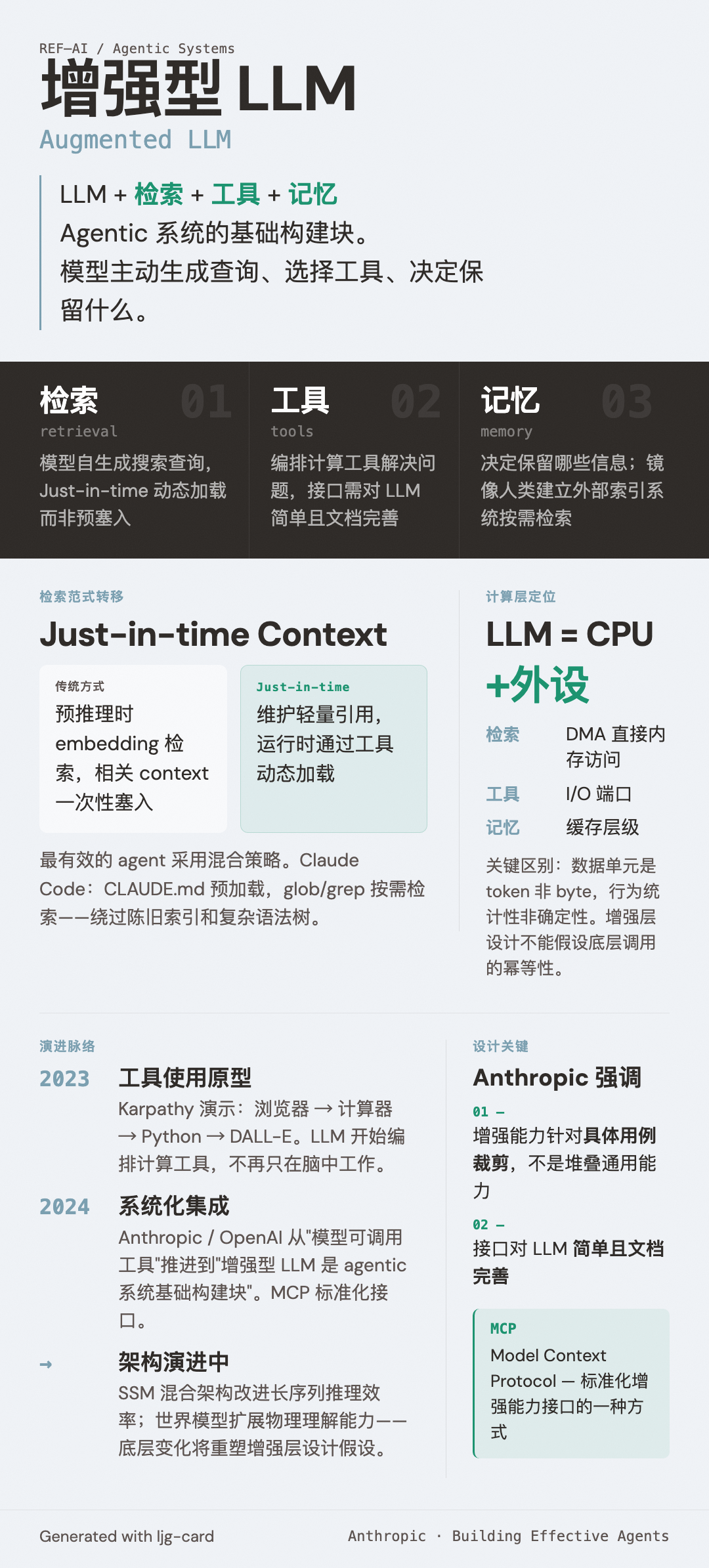 Karpathy 的 LLM-OS 类比 将 LLM 定位为 CPU——原始计算能力。在这个框架下,augmented LLM 对应的是 CPU + 协处理器/外设接口:检索是 DMA(直接内存访问),工具是 I/O 端口,记忆是缓存层级。关键区别在于 LLM 这颗"CPU"处理的数据单元是 token 而非 byte,行为是统计性的而非确定性的——这意味着增强层的设计不能假设底层调用的幂等性。