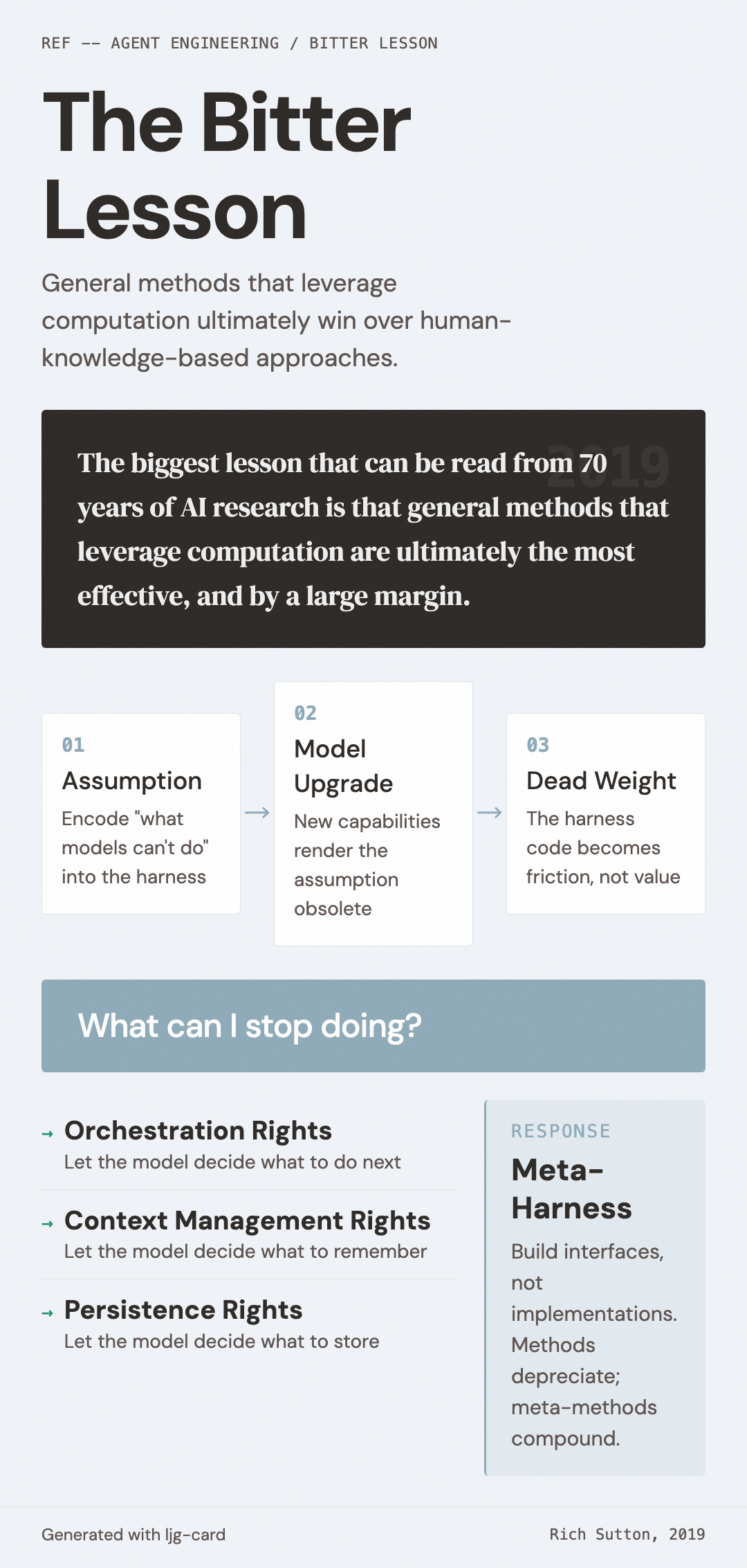 这与 Sutton 的结论同构:"要内建能找到和捕捉复杂性的元方法"——meta-harness 是 agent 基础设施层的元方法。