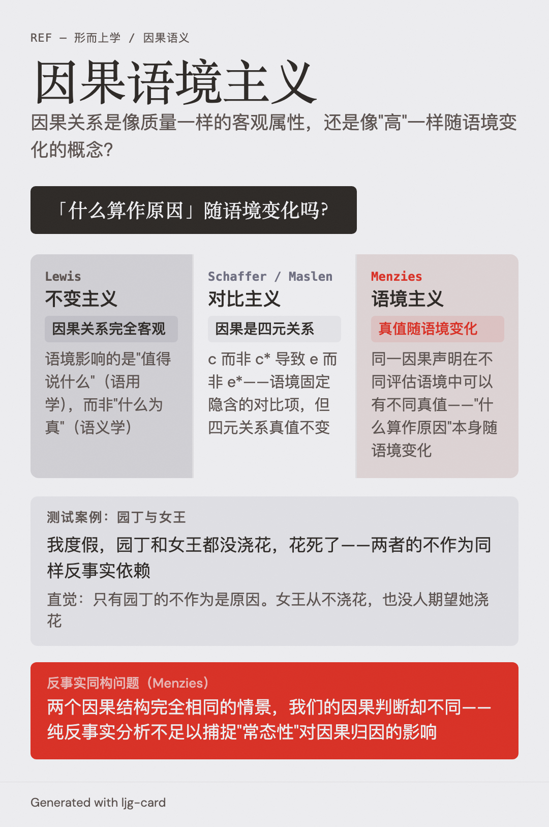 因果语境主义是关于因果判断是否依赖于评估语境的哲学立场之争。核心问题:因果关系是像质量一样的客观不变属性,还是像"高"一样随语境变化的概念?