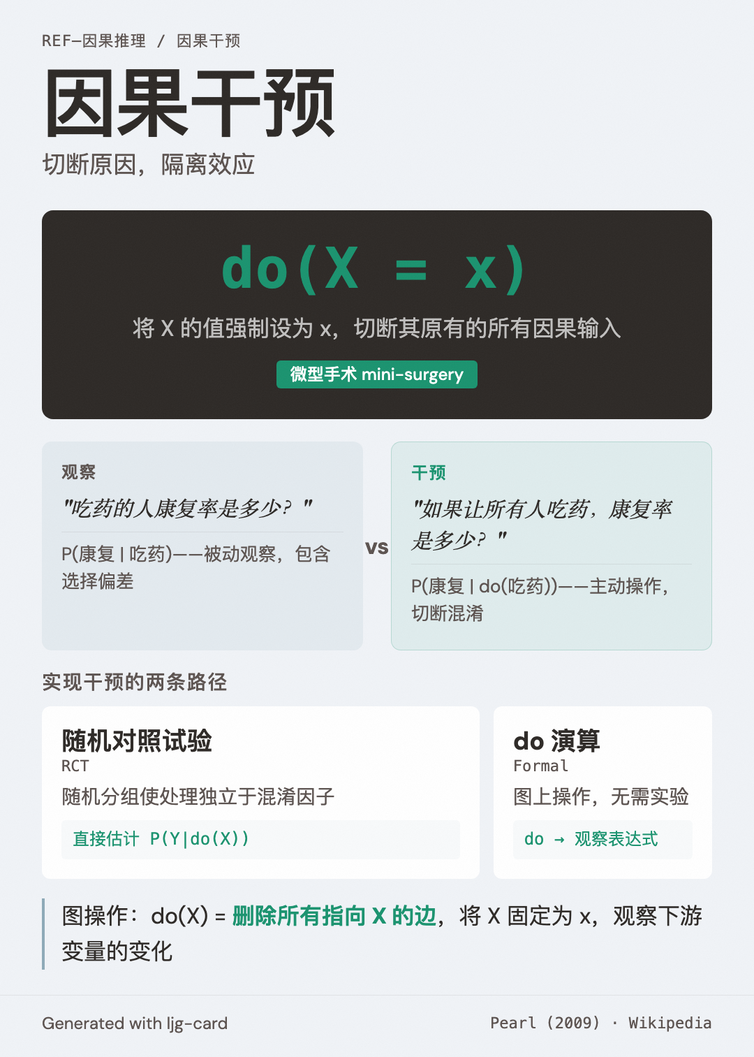 因果干预是 因果之梯 第二级的核心操作:通过外部力量将变量固定为特定值,切断其原有的因果输入,观察对下游变量的影响。在 结构因果模型 中,干预等价于删除指向被干预变量的所有箭头——Pearl 称之为"微型手术"(mini-surgery)。