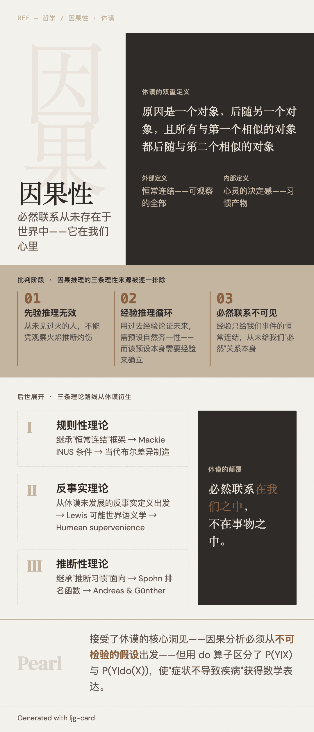 Pearl 2010 综述可以被理解为对休谟因果性批判的现代回应。休谟证明了因果推理无法建立在纯理性或纯经验之上;Pearl 的结构因果模型接受了这一结论的核心——因果分析必须从不可检验的因果假设出发——但提供了一种新的方法论出路: