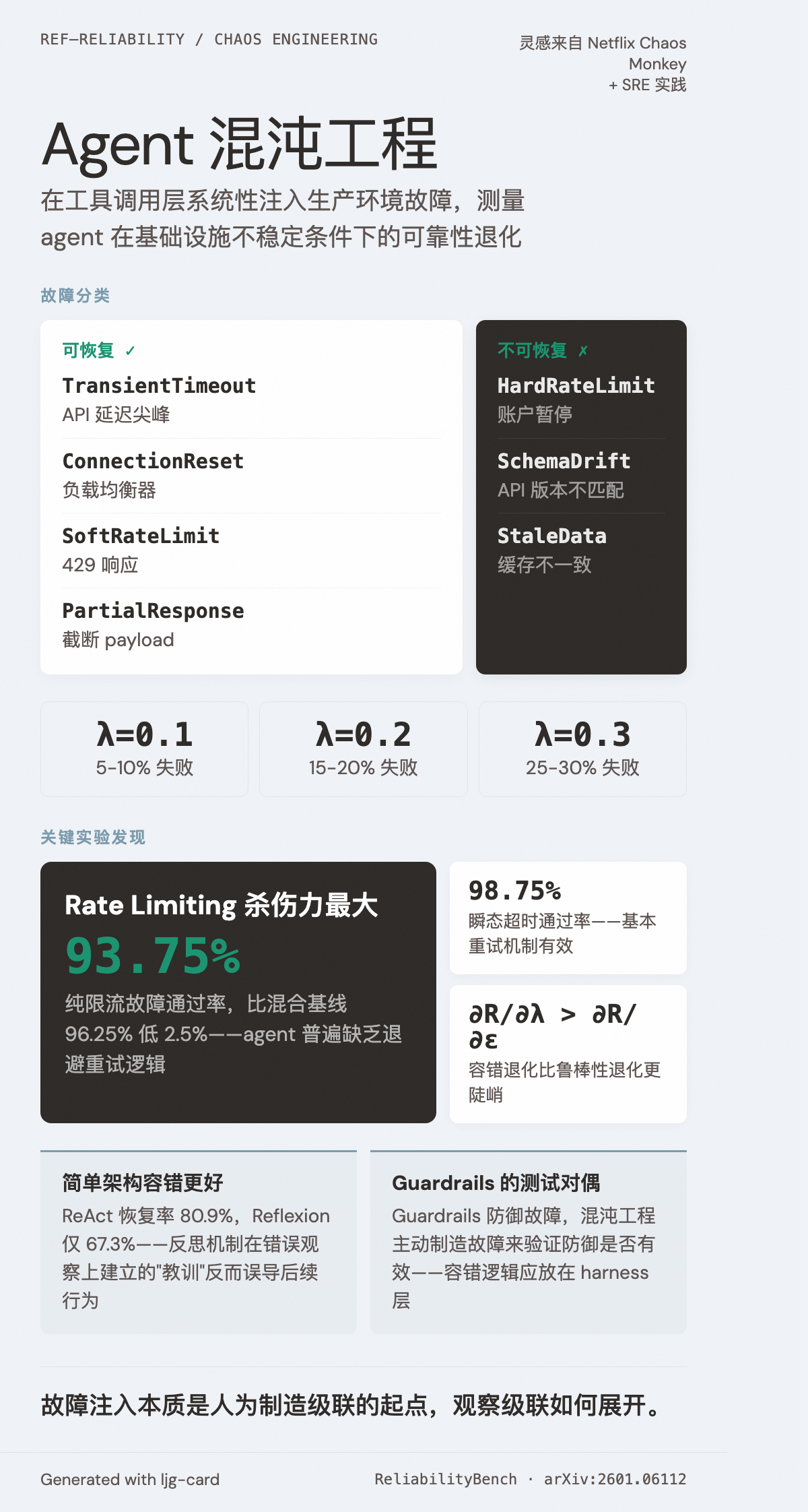 灵感来自 Netflix 的 Chaos Monkey 和 Site Reliability Engineering 实践。ReliabilityBench 首次将这一方法论系统化应用于 agent 评估。