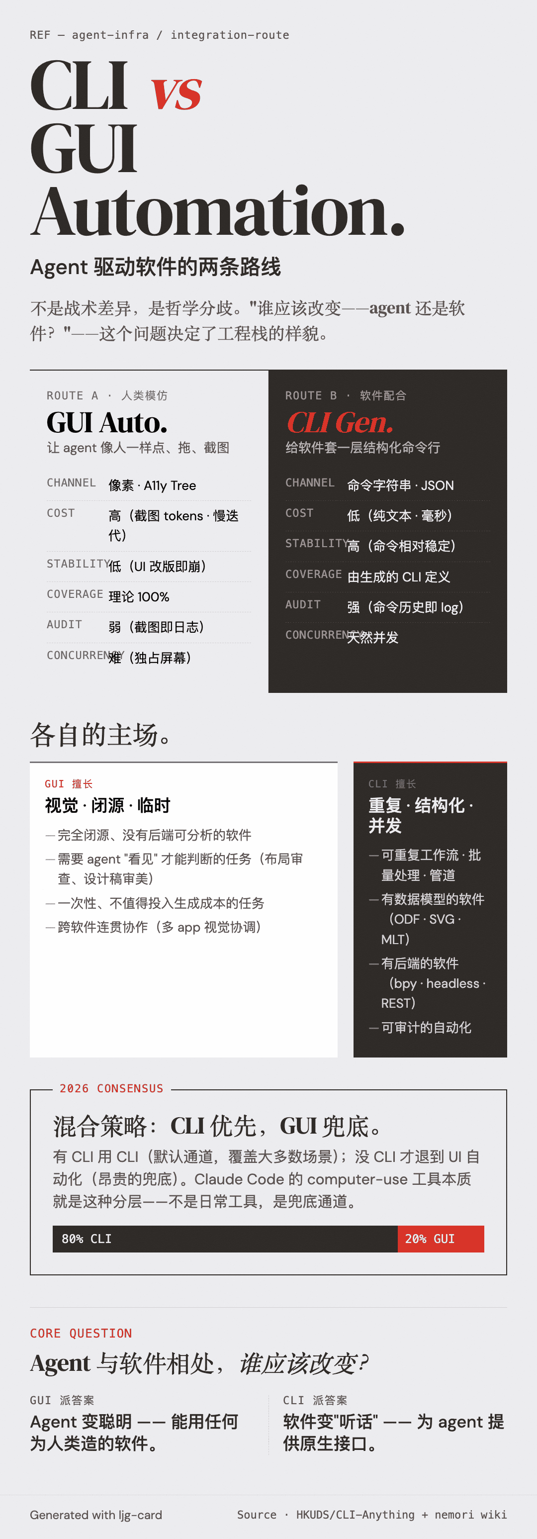 - 没 CLI 退到 UI 自动化——闭源、视觉、未覆盖的任务走 GUI 路线(20% 场景)