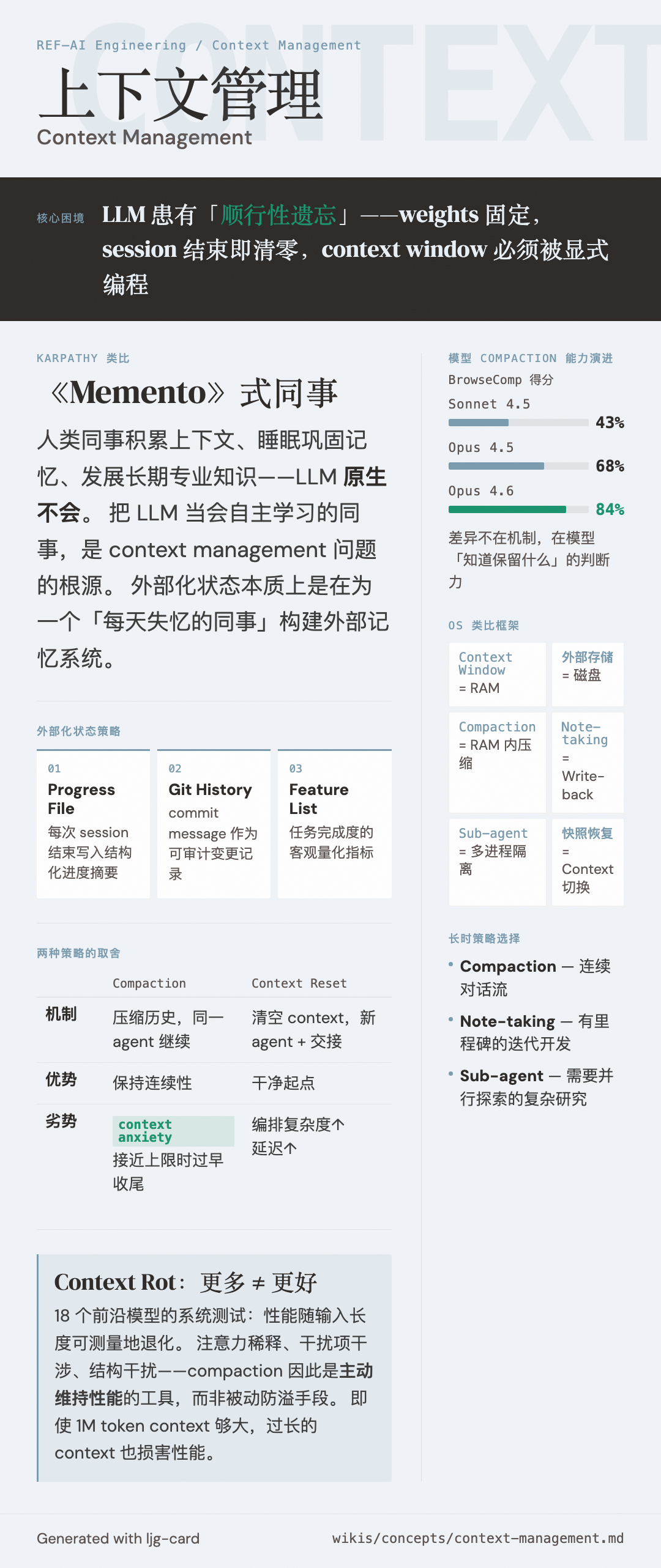 关键洞察:context management 不仅是 LLM 内部问题,更需要 harness engineering 层面的外部机制配合。