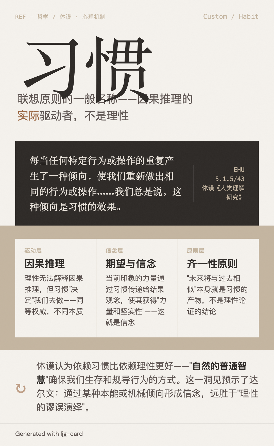 习惯不仅驱动个别的因果推理,还产生了齐一性原则——"未来将与过去相似"的信念本身就是习惯的产物。因此习惯解释了两个层面:为什么我们做特定的因果推理(因为反复经验),以及为什么我们相信这些推理是可靠的(因为习惯自然地产生了对自然齐一性的预期)。