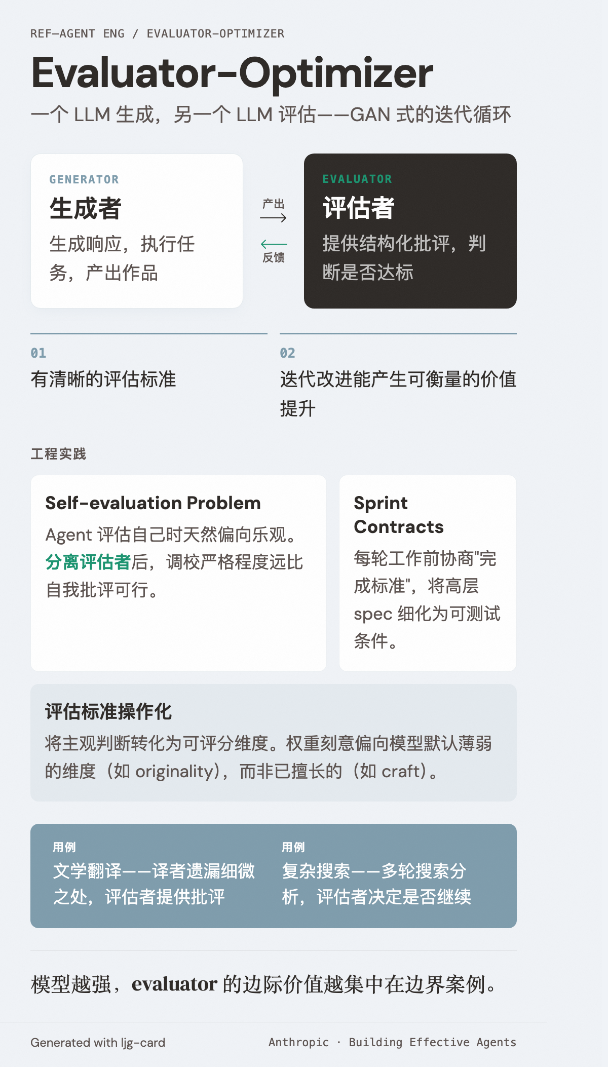属于 agentic systems 中的 workflow 模式。本质上是一个 GAN 式的生成-判别循环。与自主 agent 的区别:evaluator-optimizer 的角色(生成者、评估者)是固定的,agent 的行为是自主涌现的。