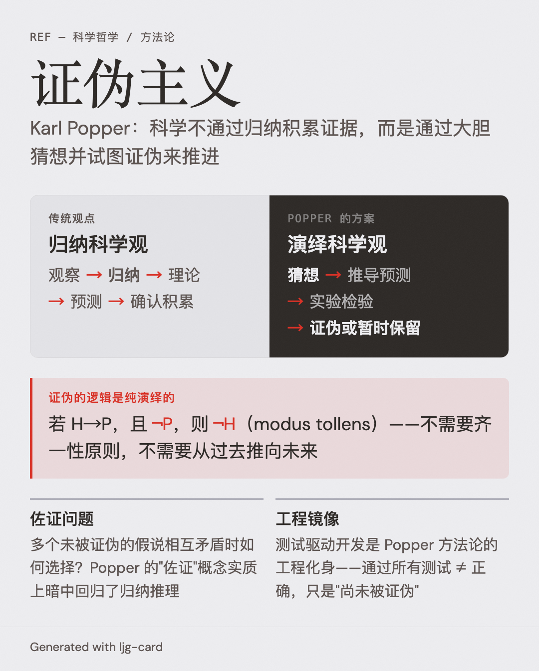 - Popper 的观点:科学 = 猜想 → 推导预测 → 实验检验 → 证伪或暂时保留