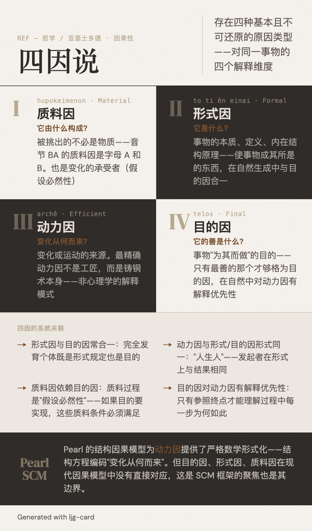 亚里士多德因果性理论的核心学说。主张存在四种基本且不可还原的原因类型,每一种对应一个不同的"为什么"问题。四因不是竞争性的替代解释,而是同一事物的四个解释维度——一个完整的科学解释需要(至多)全部四种原因的协同。