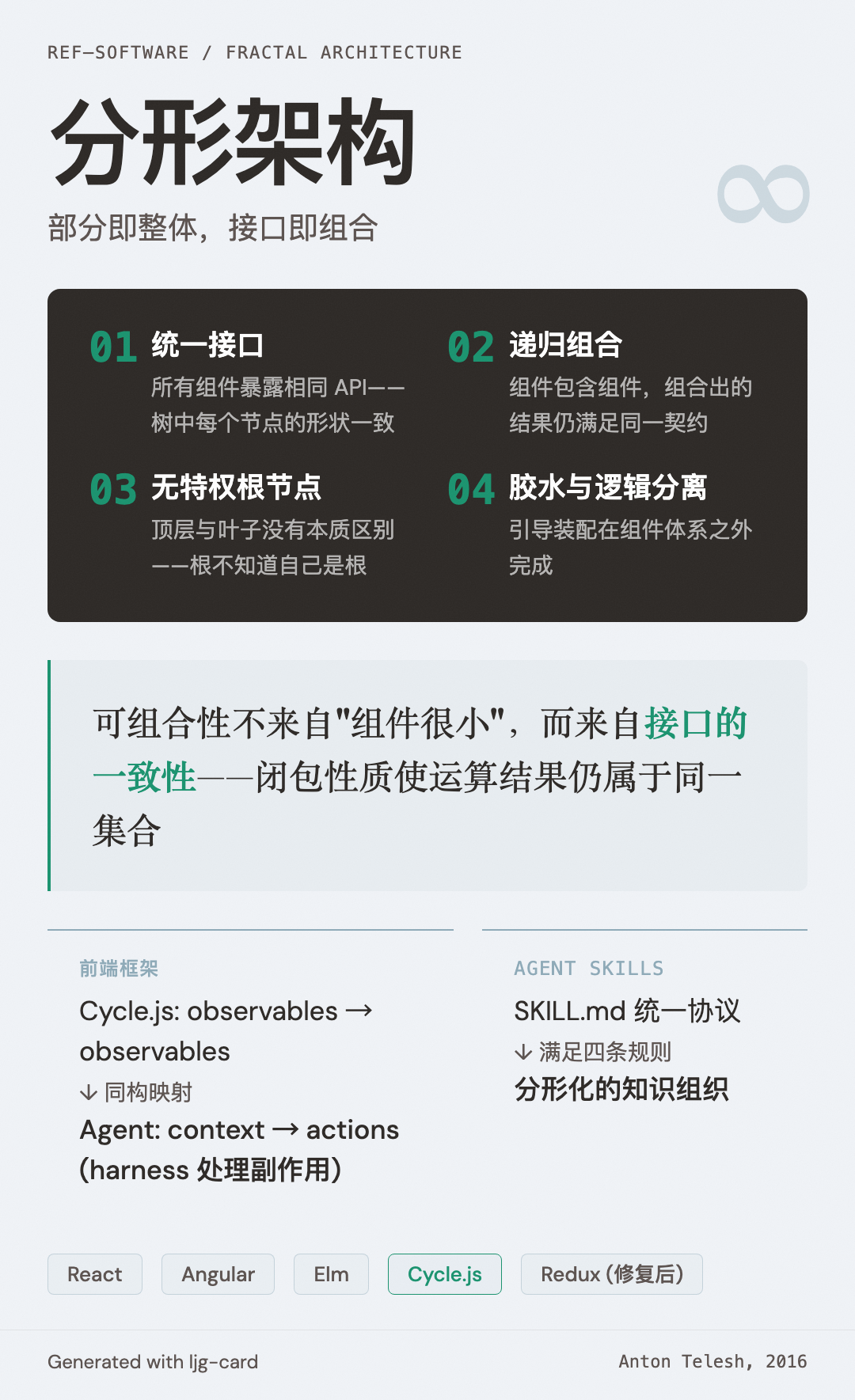 - 隐式循环架构 中 Cycle.js 的纯函数组件(observables in → observables out)与隐式循环的"行为由约束塑造而非预设路径"具有结构呼应——两者都拒绝让组件/agent 知道自己在整体中的角色