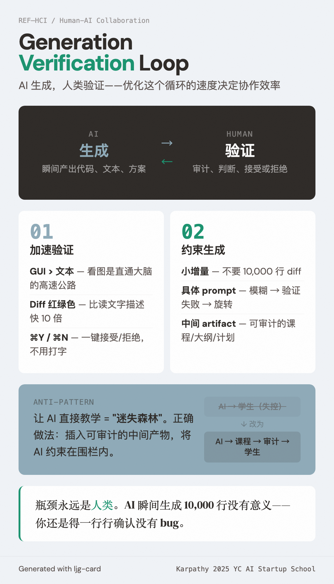 人与 AI 协作的核心模式:AI 负责生成,人类负责验证。Karpathy 在 Software Is Changing (Again) 中强调,优化这个循环的速度决定了人-AI 协作的效率。