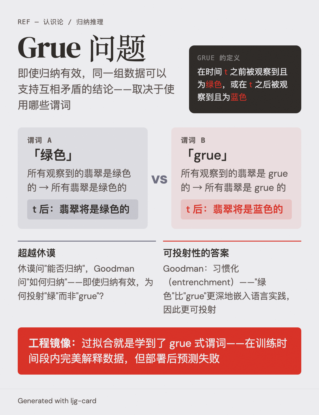- 过拟合的哲学本质:过拟合就是学到了 grue 式谓词——在训练时间段内完美解释数据,但在部署后预测失败。