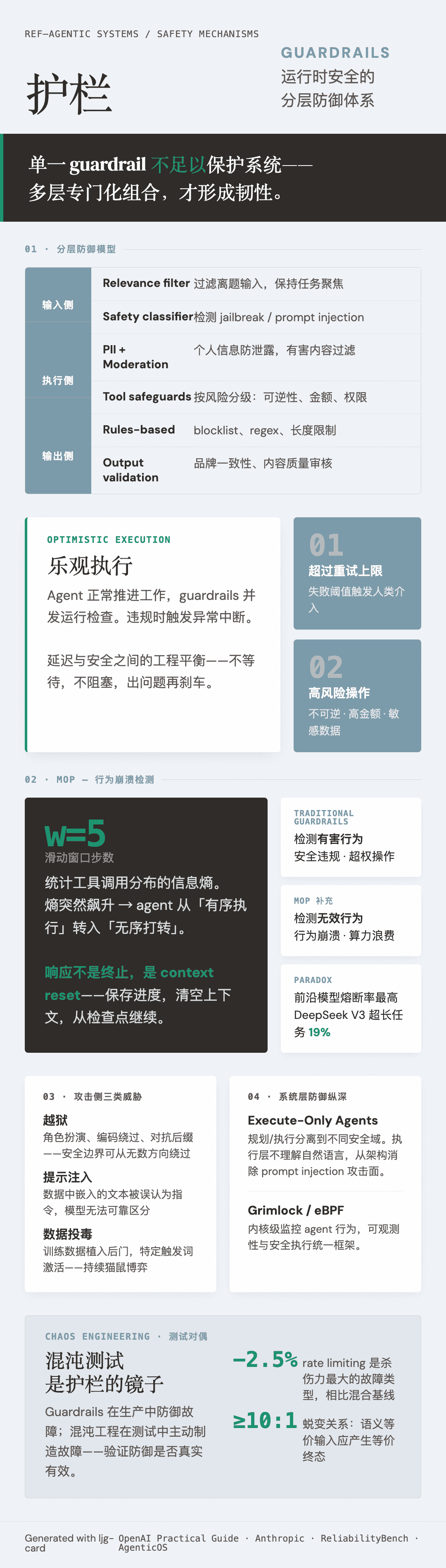 核心原则:单一 guardrail 不足以保护系统,多层专门化 guardrails 组合形成韧性。