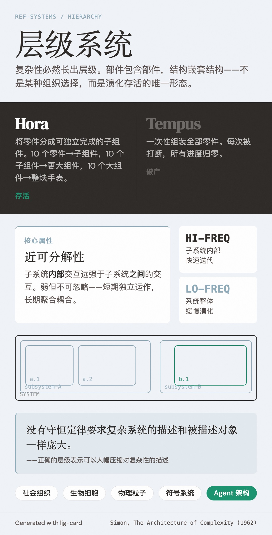 Herbert Simon 在 The Architecture of Complexity(1962)中指出层级结构是复杂系统最普遍的组织形式: