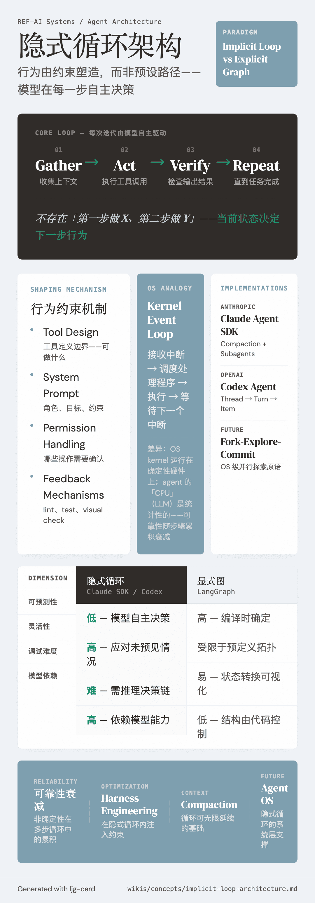 隐式循环是 agent 系统的一种架构范式:agent 在一个开放的反馈循环中运行——gather context → take action → verify work → repeat——每一步由模型自主决定,而非预定义的流程图。