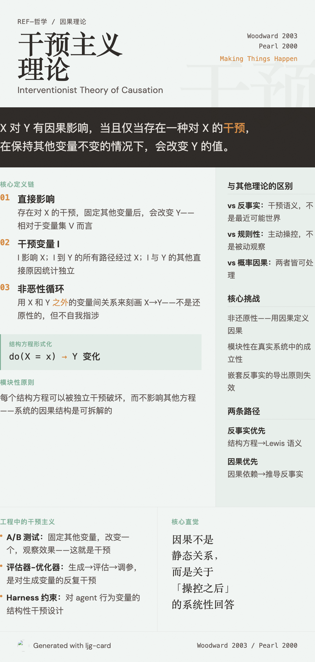 干预主义理论主张因果关系应通过干预来理解:X 对 Y 有因果影响,当且仅当存在一种对 X 的干预,在保持其他变量不变的情况下,会改变 Y 的值。因果不是静态的关系,而是关于"如果你操控 X 会怎样"的系统性回答。