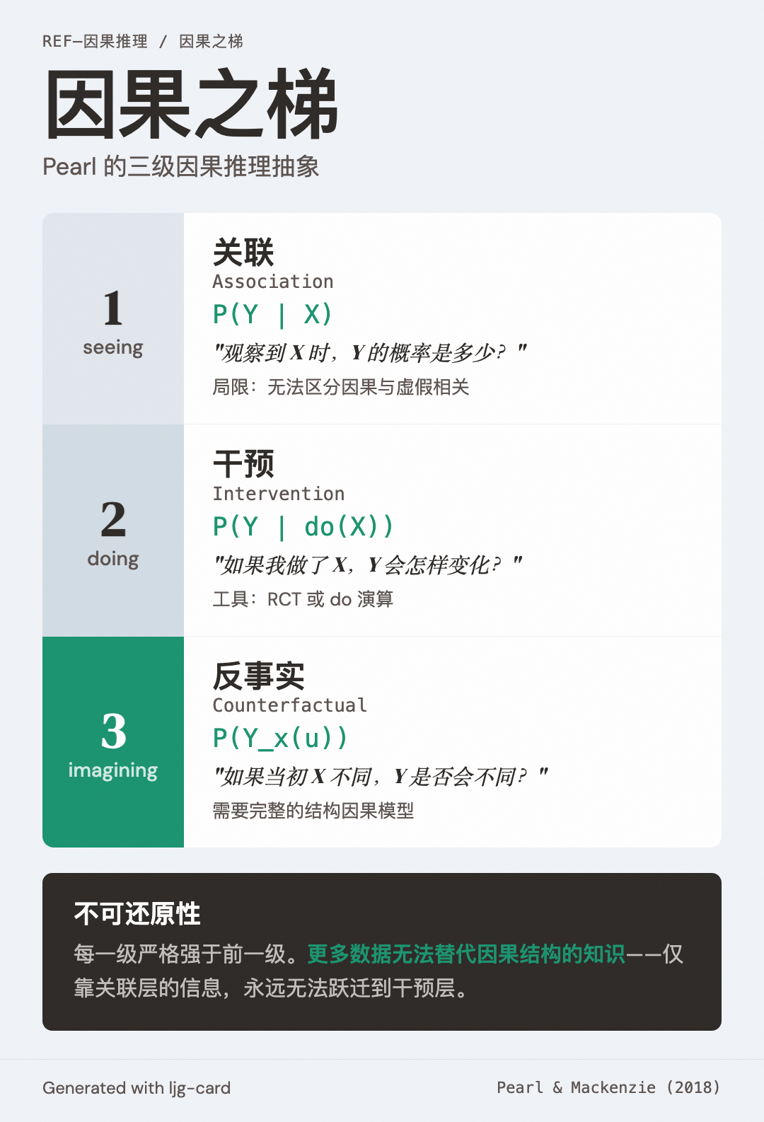 因果之梯是 Judea Pearl 提出的因果推理三级抽象层次,刻画了从被动观察到主动干预再到想象性反事实推理的认知跃迁。每一级能回答前一级无法回答的问题。