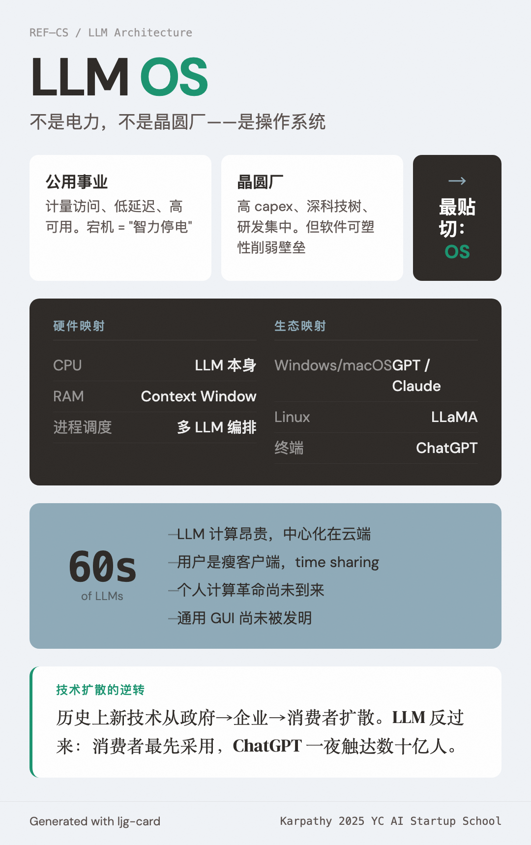 Karpathy 断言我们处于 LLM 计算的 1960 年代: - LLM 计算昂贵 → 中心化在云端 - 用户是瘦客户端,通过网络连接 - Time sharing(用户共享批次维度) - 个人计算革命尚未到来(Mac Mini 做 batch-1 推理是早期迹象) - 通用 GUI 尚未被发明(ChatGPT = 终端)
