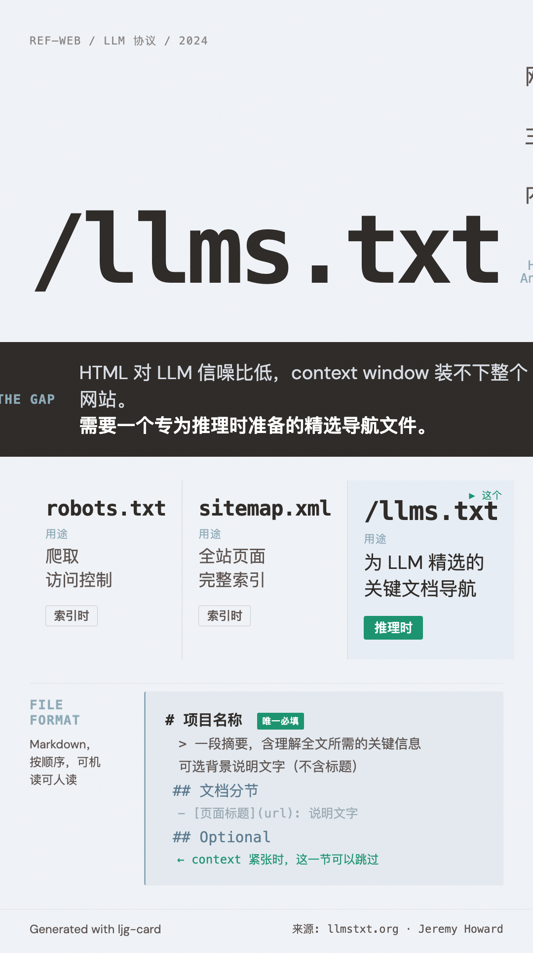 llms.txt 是一个放置在网站根路径 /llms.txt 的 Markdown 文件,为 LLM 提供关于该网站的结构化、精简的文档导航。由 Jeremy Howard(Answer.AI)于 2024 年 9 月提出。