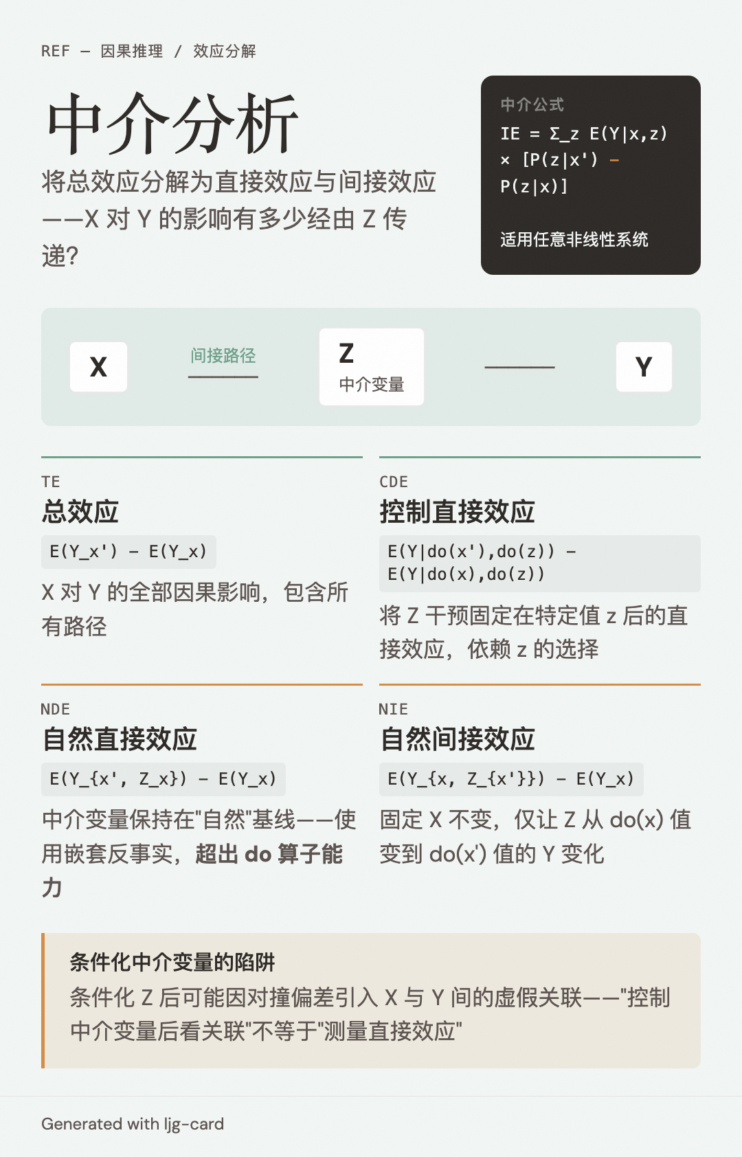 - 因果 DAG: 中介变量对应链结构 X → Z → Y 中的中间节点