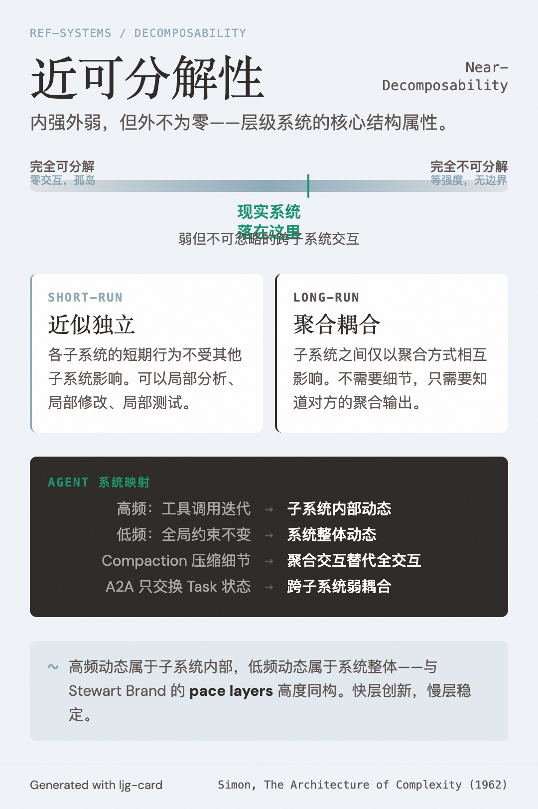 近可分解性为理解 agent 系统架构提供了精确的分析框架:
