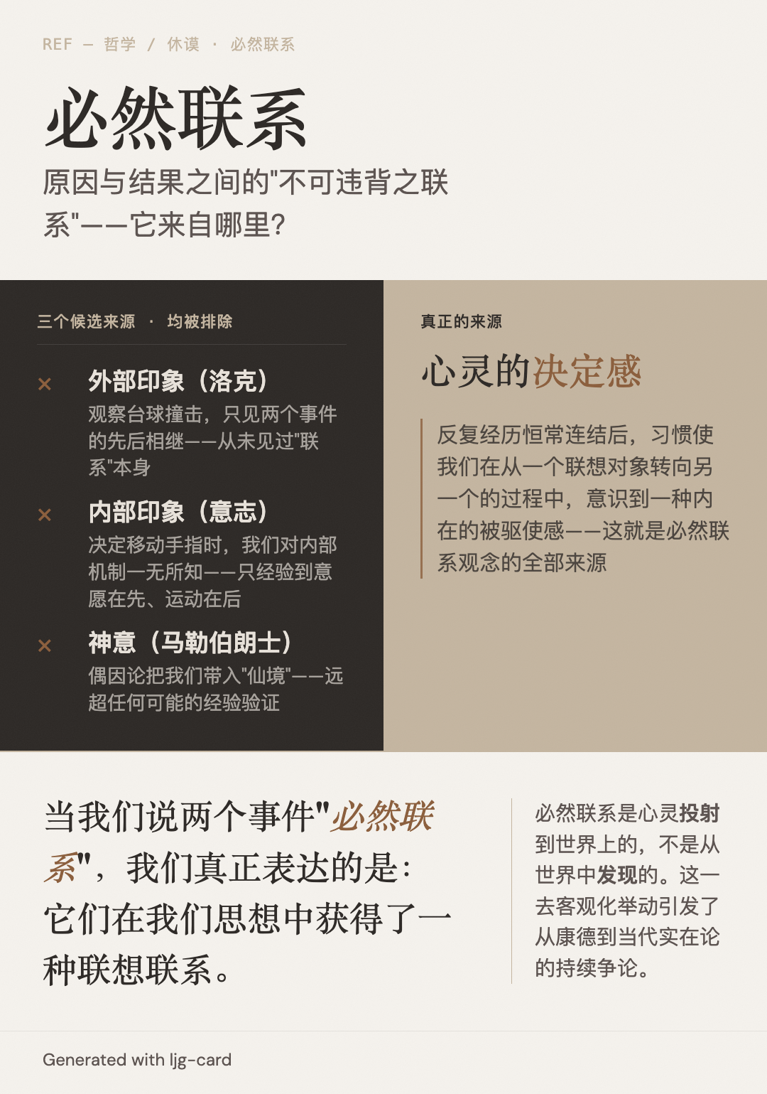 因此,当我们说两个事件"必然联系"时,我们真正表达的是:这两个对象在我们的思想中获得了一种联想联系,驱使我们从一者推断另一者。必然联系是心灵投射到世界上的,不是从世界中发现的。