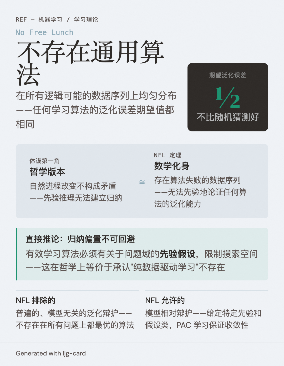 No Free Lunch(NFL)定理是机器学习中的一组基础性不可能性结果:在所有逻辑可能的数据序列上取均匀分布,任何学习算法的泛化误差期望值为 1/2——不比随机猜测好(Wolpert 1992, 1996, 1997)。换言之,不存在在所有问题上都优于其他算法的"通用"学习算法。