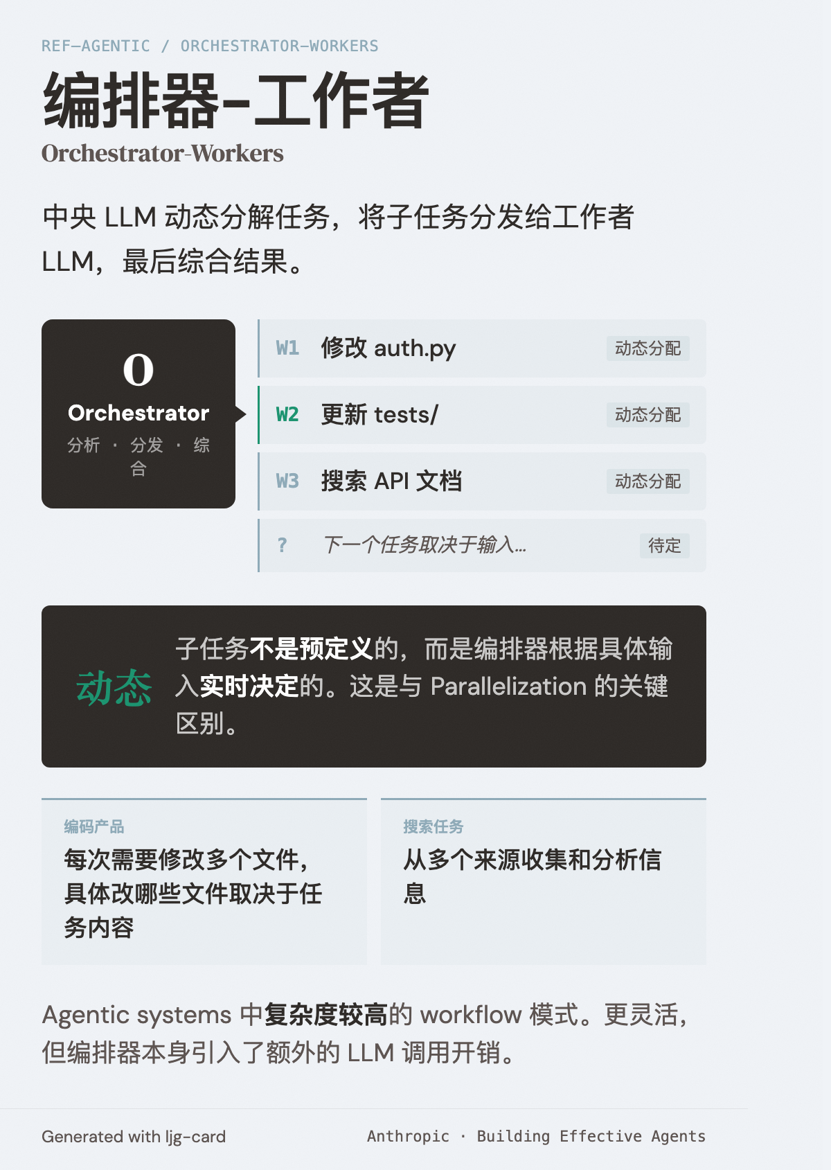 属于 agentic systems 中复杂度较高的 workflow 模式。比 parallelization 更灵活,但编排器本身引入了额外的 LLM 调用开销。