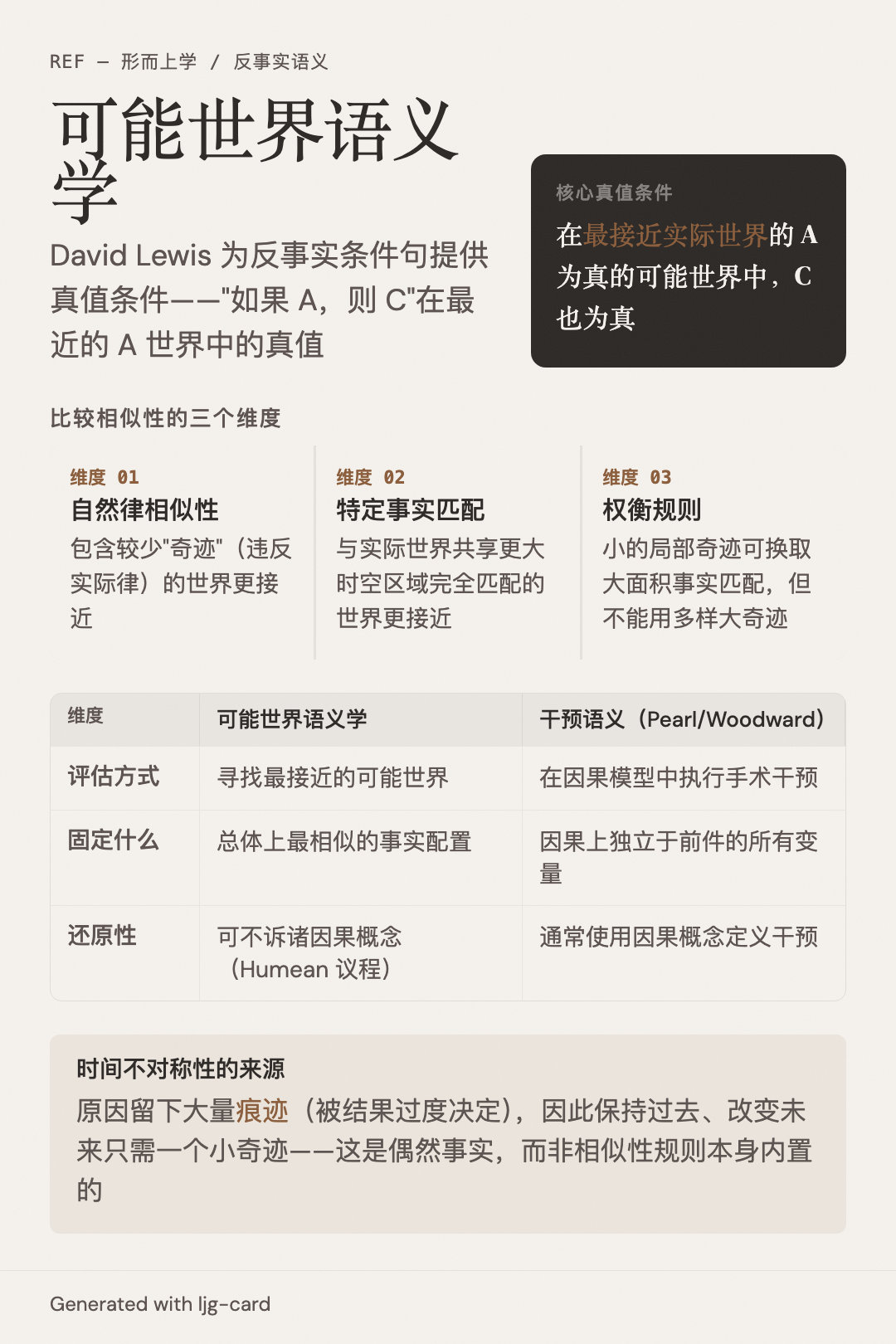 - 因果性(休谟):Lewis 明确继承休谟的经验主义传统,可能世界语义学服务于 Humean supervenience 议程