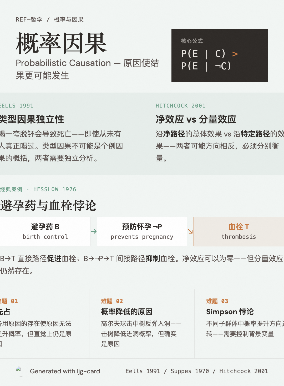 经典案例来自 Hesslow (1976):避孕药直接促进血栓(\(B \to T\)),但也预防怀孕(\(B \to \neg P\)),而怀孕本身促进血栓(\(P \to T\))。调整概率后,避孕药对血栓的净效应可以为零,但沿 \(B \to T\) 路径的分量效应仍是正面的。