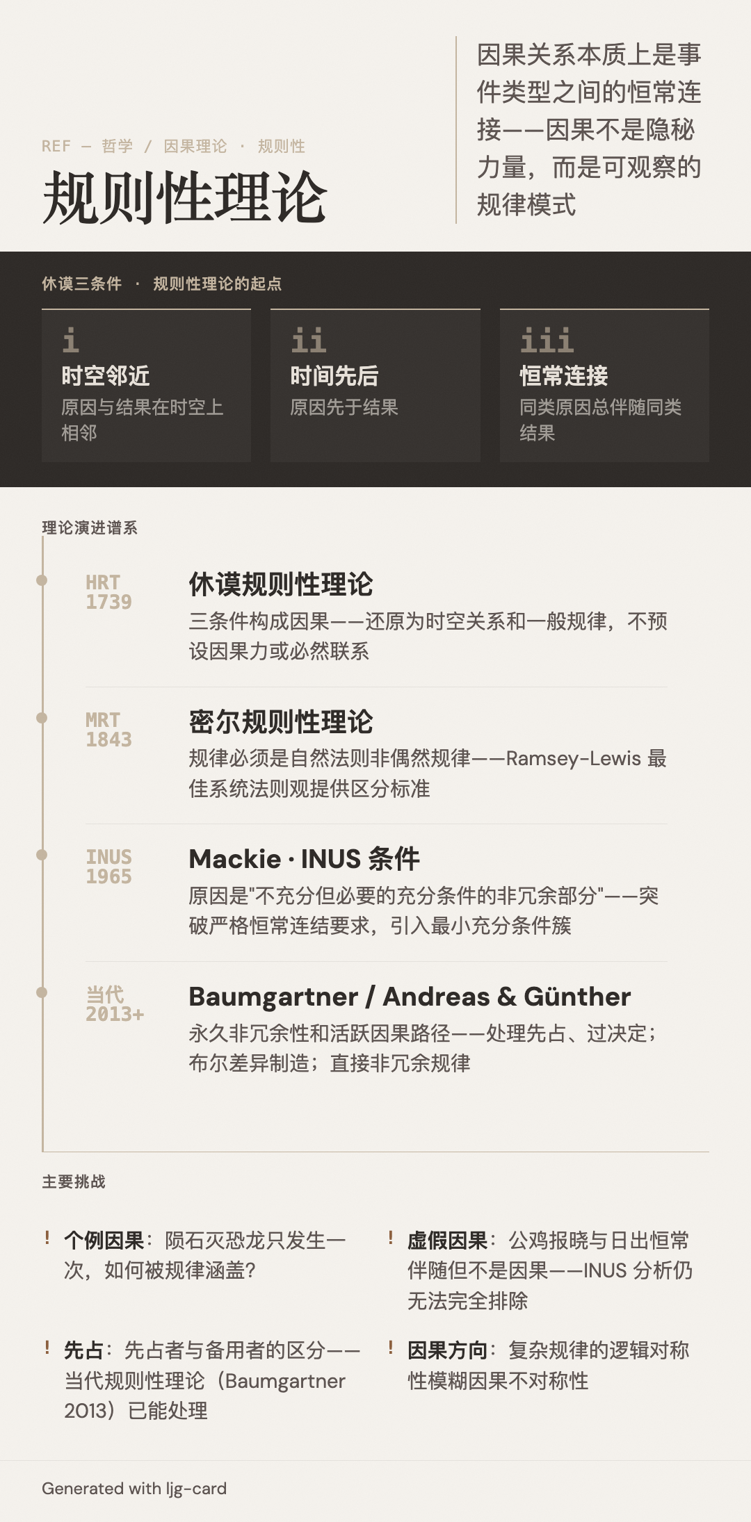 - 与反事实理论的对比:规则性理论向前看(正面规律),反事实理论向后看(如果原因不存在会怎样)。Lewis (1973) 的经典批评曾使规则性理论陷入低谷,但当代发展已大幅缩小差距。