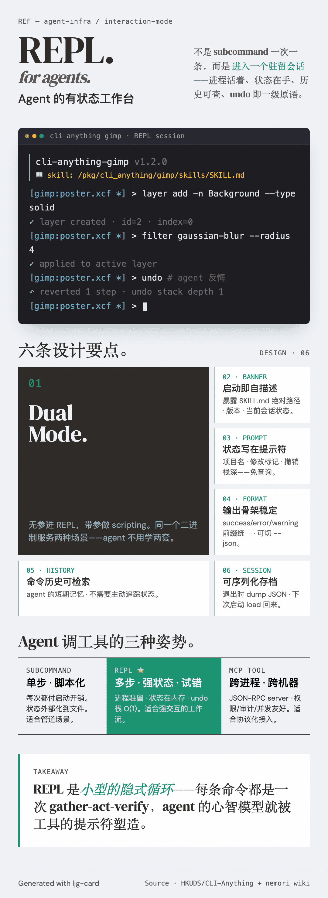 裸命令 cli-anything-gimp 进 REPL;cli-anything-gimp project new ... 做一次性调用。同一个二进制同时服务两种调用场景——agent 可以按场景切换,不需要学两套工具。