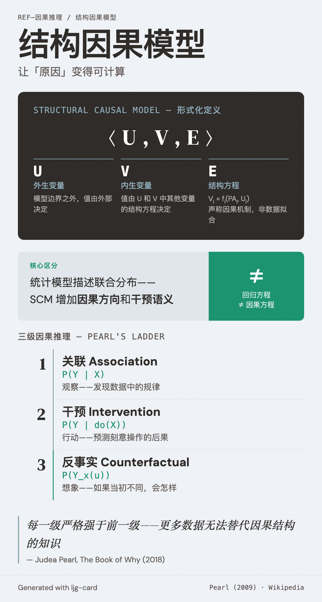 结构因果模型(SCM)是 Judea Pearl 提出的因果推理形式化框架。它将因果关系从哲学直觉提升为严格的数学对象,使"原因"可以被定义、计算和验证。