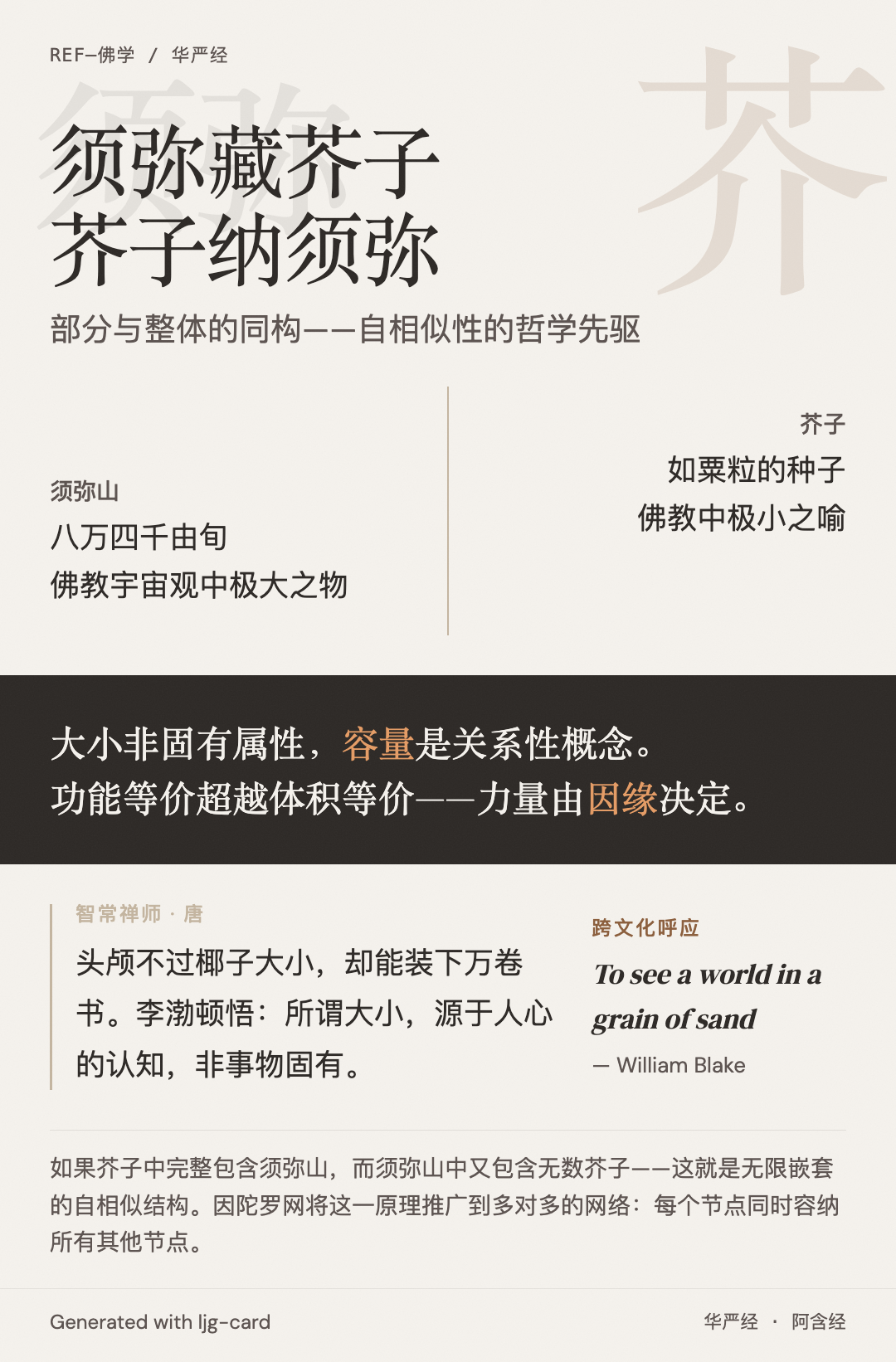 sources/sumeru-mustard-seed-buddhist.md— 须弥藏芥子佛教典故解读sources/fractal-buddhism-avatamsaka-sutra.md— 华严经分形解读中须弥芥子的理论背景