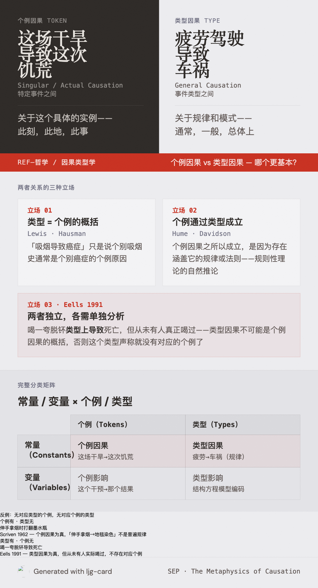 - 个例因果(Token Causation / Singular Causation / Actual Causation):关于特定事件之间的因果关系。"这场干旱导致了这次饥荒。"