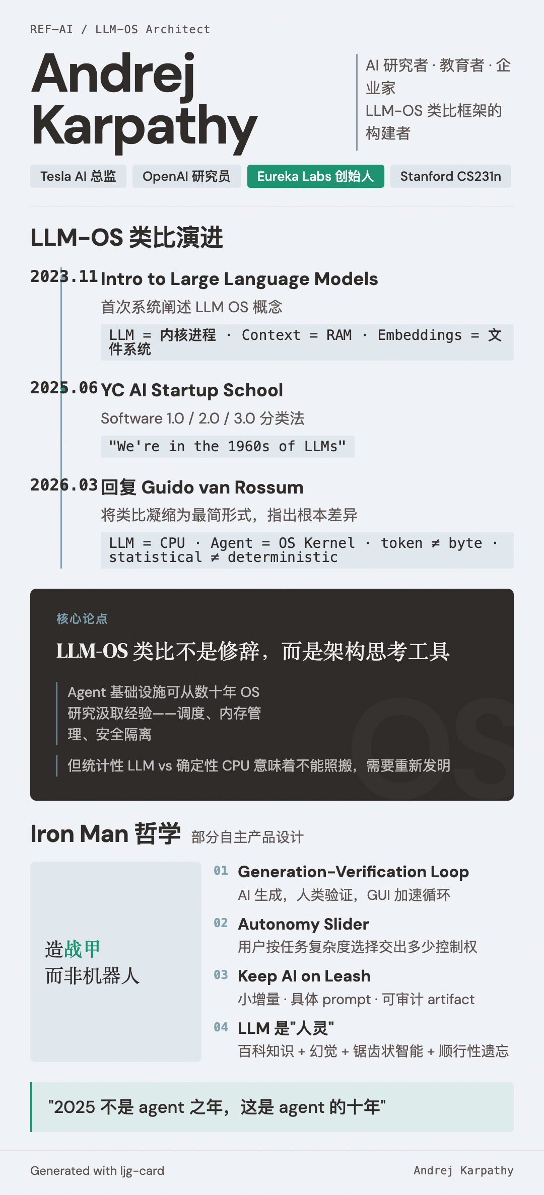 - 2025-06(补充):在 YC AI Startup School 演讲 中系统阐述了 Software 3.0 分类法、LLM OS 类比、LLM 的"人灵"心理学、部分自主产品 设计(autonomy slider、generation-verification loop、GUI 审计)、vibe coding、为 agent 构建基础设施。核心论断:"We're in the 1960s of LLMs"。