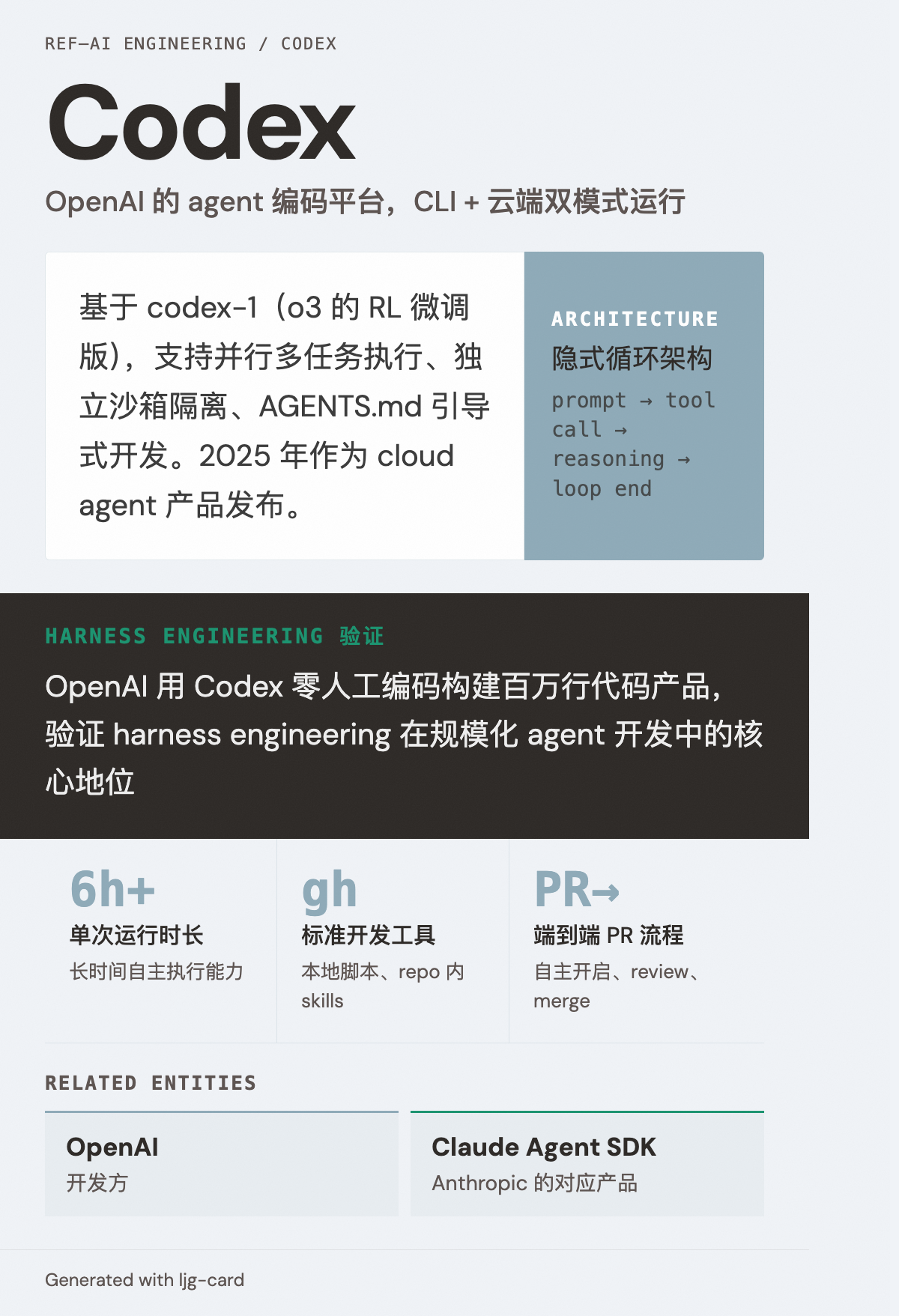 Codex 是 OpenAI 的 agentic 编码解决方案,类似于 Anthropic 的 Claude Agent SDK。其内部运行 隐式循环架构(Runner 组件驱动 prompt → tool call → reasoning → loop end 循环)。