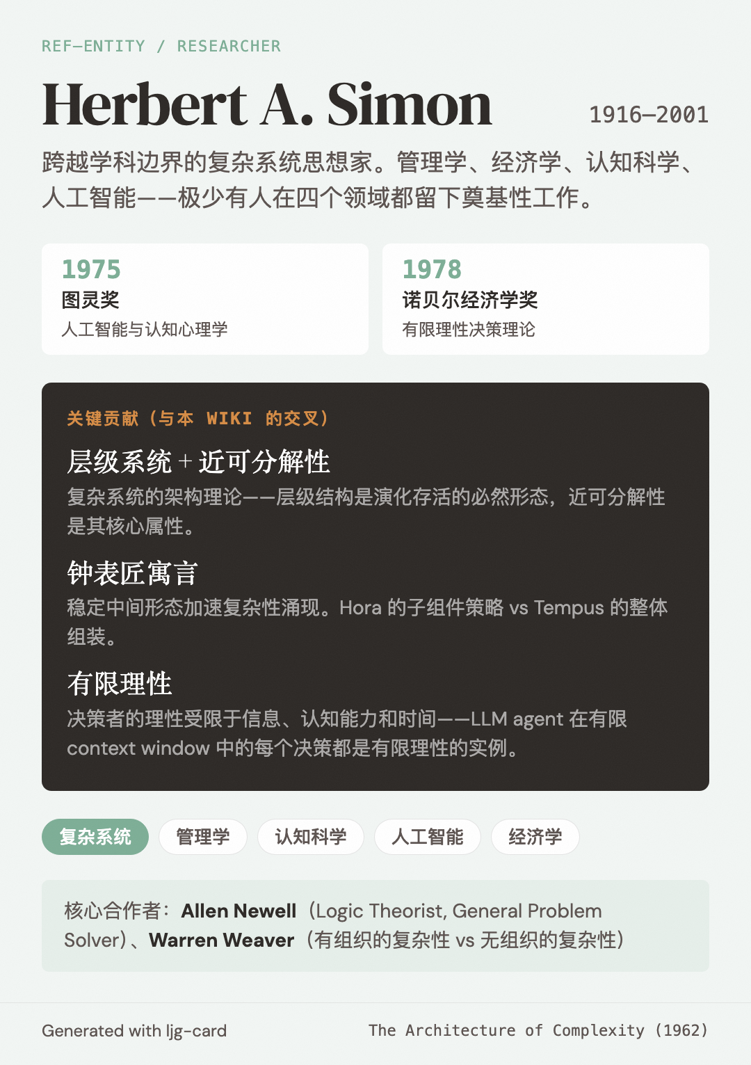 Simon 是少数真正跨越学科边界的思想家——他的研究横跨管理学、经济学、认知科学、人工智能和复杂系统理论。