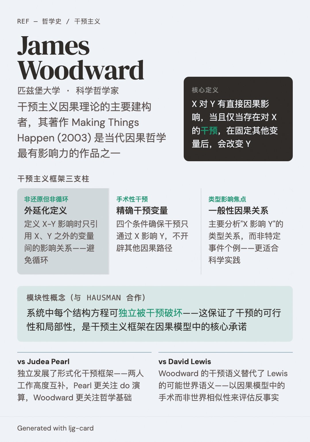 Woodward 在 Making Things Happen (2003) 中提出了系统的干预主义框架:
