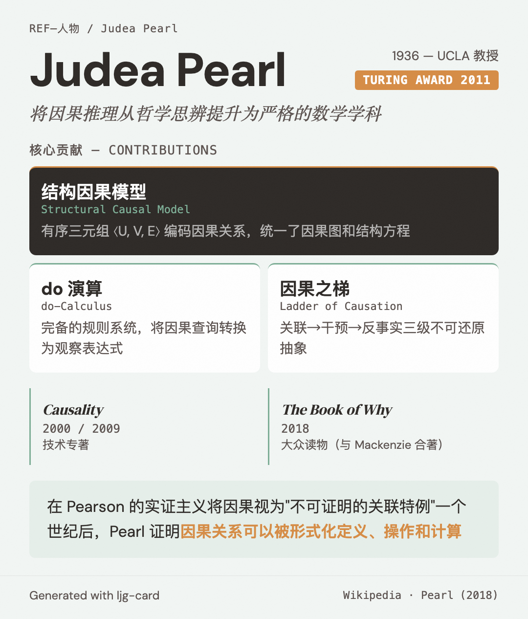 Pearl 的核心贡献是将因果推理从哲学思辨提升为严格的数学学科。在他之前,主流统计学将因果视为"不可证明的关联特例"(Pearson 的实证主义传统)。Pearl 证明因果关系可以被形式化定义、操作和计算。