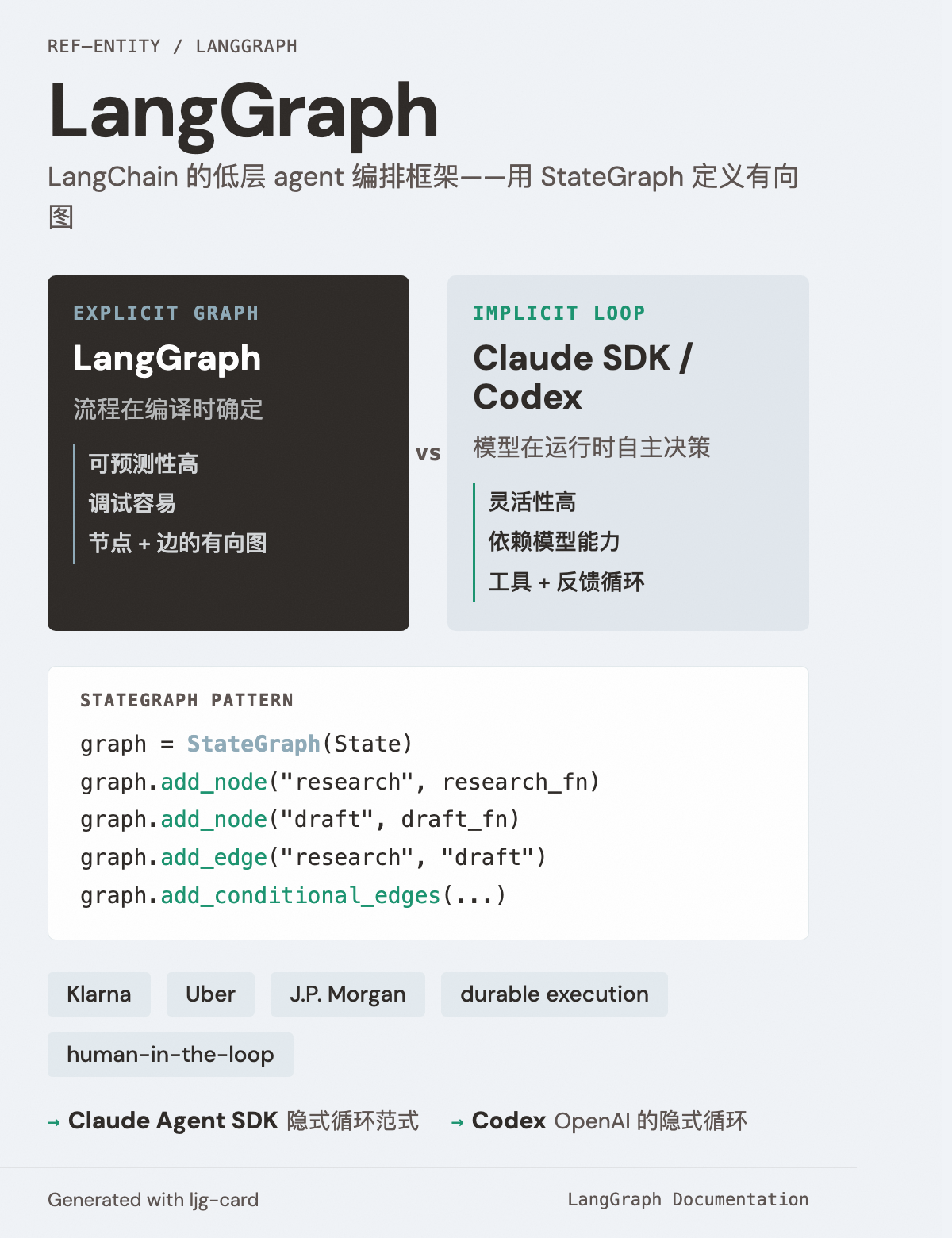 LangGraph 是 隐式循环架构(Claude Agent SDK、Codex)的主要对比范式。两者代表了 agent 编排的两极: