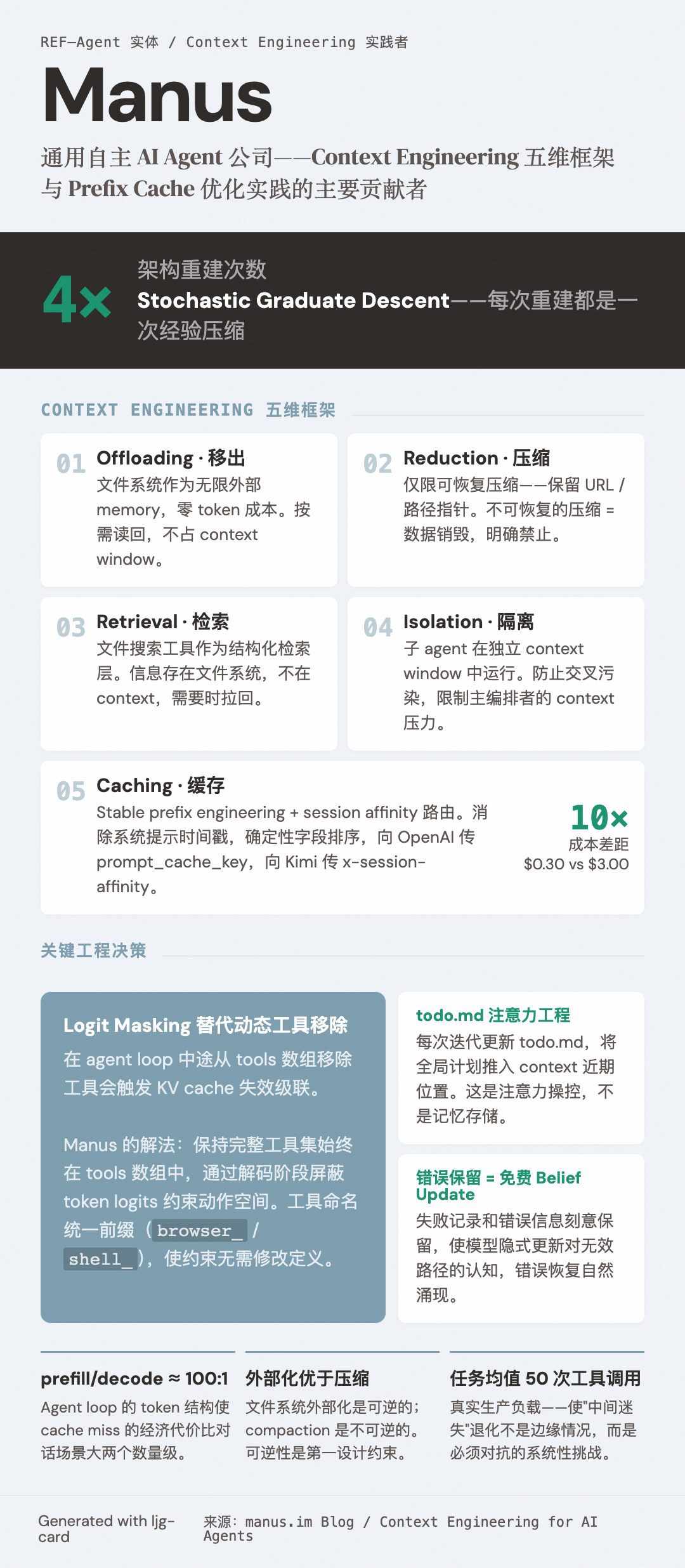 Manus 经历了四次架构重建(自称"Stochastic Graduate Descent"),发展出一套生产验证的 context engineering 五维框架: