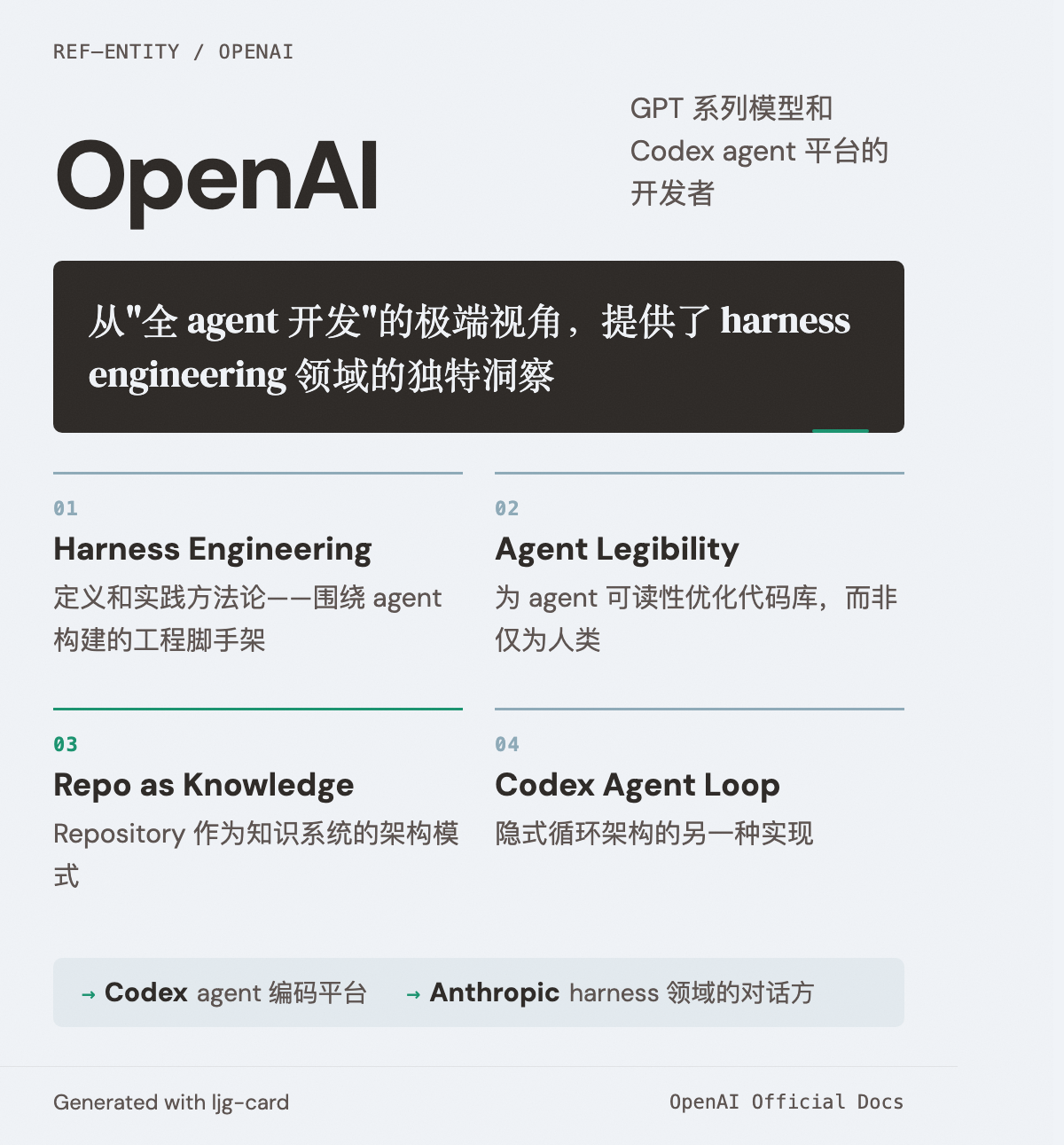 OpenAI 是本项目 harness engineering 主题的重要参考来源。其实践从"全 agent 开发"的极端视角提供了独特洞察: - Harness engineering 的定义和实践方法论 - Agent legibility 的概念——为 agent 可读性优化,而非仅为人类 - Repository 作为知识系统的架构模式 - 隐式循环架构 的另一种实现(Codex agent loop)