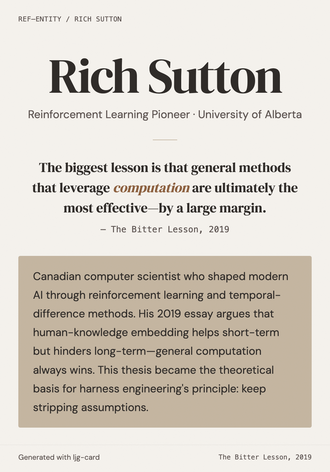 Sutton 的 2019 年短文 The Bitter Lesson 对 agent engineering 有深远影响:其核心论点(通用计算方法总是胜出,人类知识内建短期有效但长期阻碍进展)成为 harness engineering 中"持续剥离假设"原则和 meta-harness 架构的理论基础。
