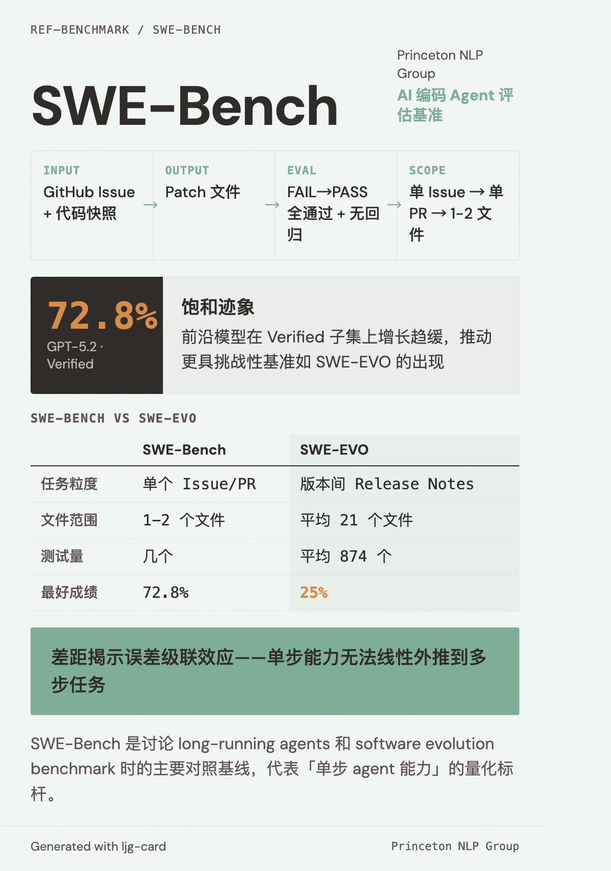SWE-Bench 是由 Princeton NLP Group 发布的 AI 编码 agent 评估基准,从真实 GitHub issue 和对应的 pull request 中构造任务。Agent 需要为给定的 issue 生成可通过测试验证的补丁。